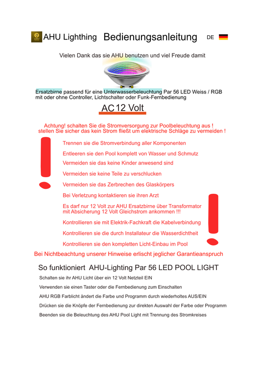 Entdeckenmodernste Unterwasserbeleuchtung von AHU macht aus ihren Wasser ein besonderes Erlebnis mit Farbwechsel je nach Wunsch oder Situation wie Party oder Wellnes usw. Verwenden sie unsere Unterwasserspots und PAR56 AHU Beleuchtung und verbinden sie es mit Ihrem Haus-Wlan, Blutooth oder der Fernbedienung mit Farbring.
